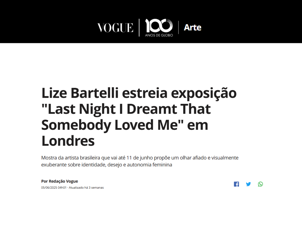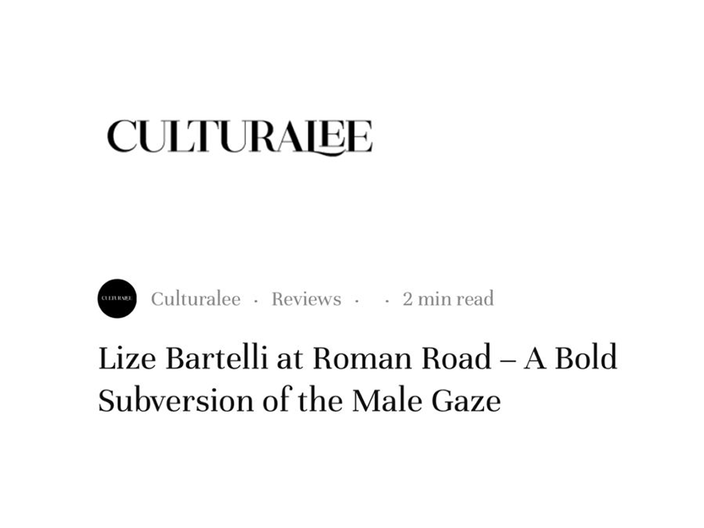 press VOGUE BRASILLize Bartelli debuts "Last Night I Dreamt That Somebody Loved Me" exhibition in London. hestetikaInterview – LIZE BARTELLI: I paint women who are not ashamed of their presence CITZEN FEMMEWhat To See At London Gallery Weekend 2025. CULTURALEELize Bartelli at Roman Road – A Bold Subversion of the Male Gaze mayfair timesThe bigger picture. Bold ideias, vivid colors and sweeping retrospectives jolt June into life. FAD MAGAZINEBrazilian Artist Lize Bartelli Talks to FAD About Her Debut UK Solo Exhibition at Roman Road Gallery. SHOWstudioSHOWnews: London Gallery Weekend. architectural digestBrazilian Painter Lise Grendene’s London Town House Celebrates All-Female Artists. artnetAs a Celebration of London’s Resilience, Cartier UK Has Enlisted Artists and Designers to Turn Its Boutique Into a Rainbow-Hued Art Gallery. les nouveaux richesLise Grendene. Very deep emotions.